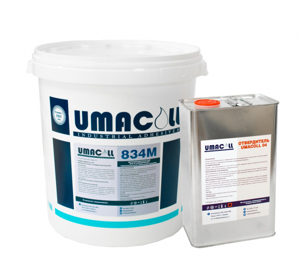 2) Umacoll 834M - двухкомпонентный. Фасовка в вёдра пластик 30 кг + с каждым ведром идёт фасованный отвердитель в отдельной ёмкости 1,5 кг.